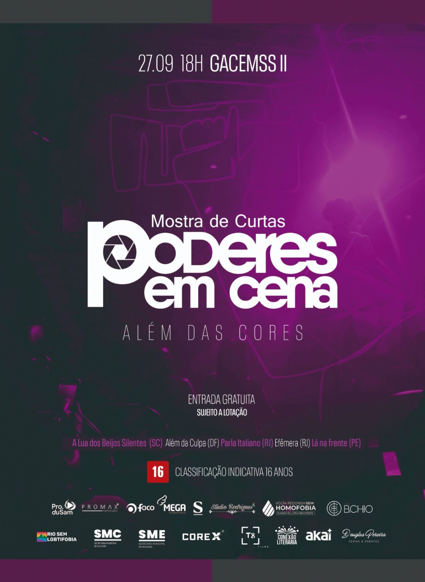 No sábado, dia 27 de setembro, o Teatro GACEMSS 2 recebe a III Mostra não competitiva de curtas-metragens LGBTI “Poderes em cena – Além das cores”. A exibição começa às 18h e contará com cinco filmes, além de performances, expositores e bate-papos. A classificação é de 16 anos e a entrada é franca, sujeita à lotação do espaço, que comporta 115 lugares.