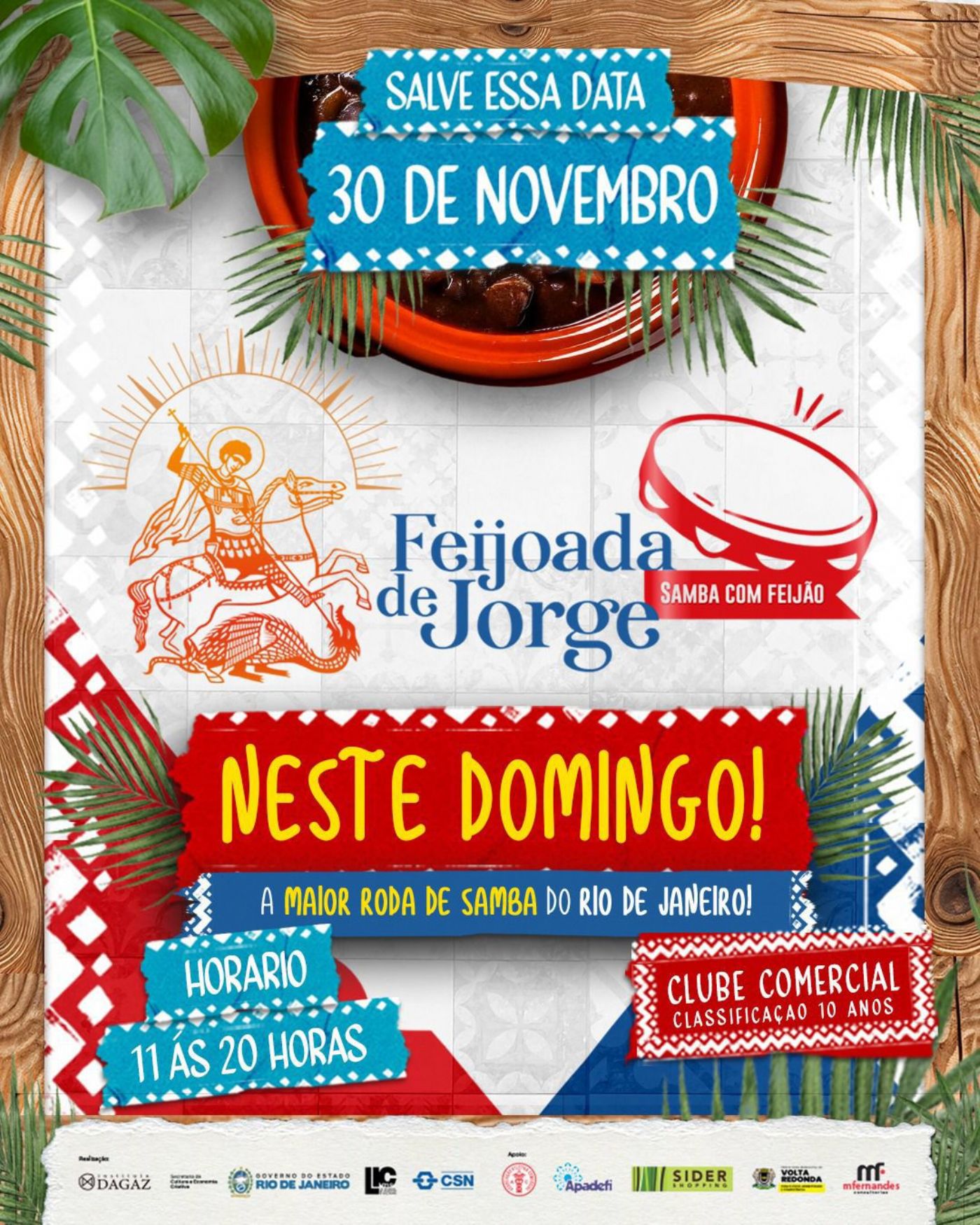 A Feijoada de Jorge: Samba com Feijão acontece neste domingo, 30 de novembro, no Clube Comercial de Volta Redonda, e os convites estão chegando ao fim. Quem ainda não garantiu o seu pode comprar pelo Sympla ou nos pontos de venda oficiais: No segundo piso do Sider Shopping, Neto Esportes (Amaral Peixoto) e Botequim da Vila (ao lado do Memorial Zumbi).