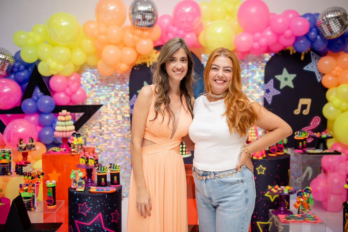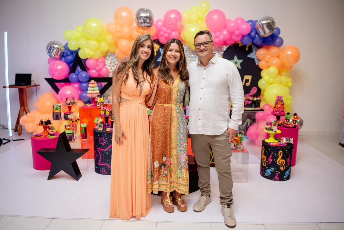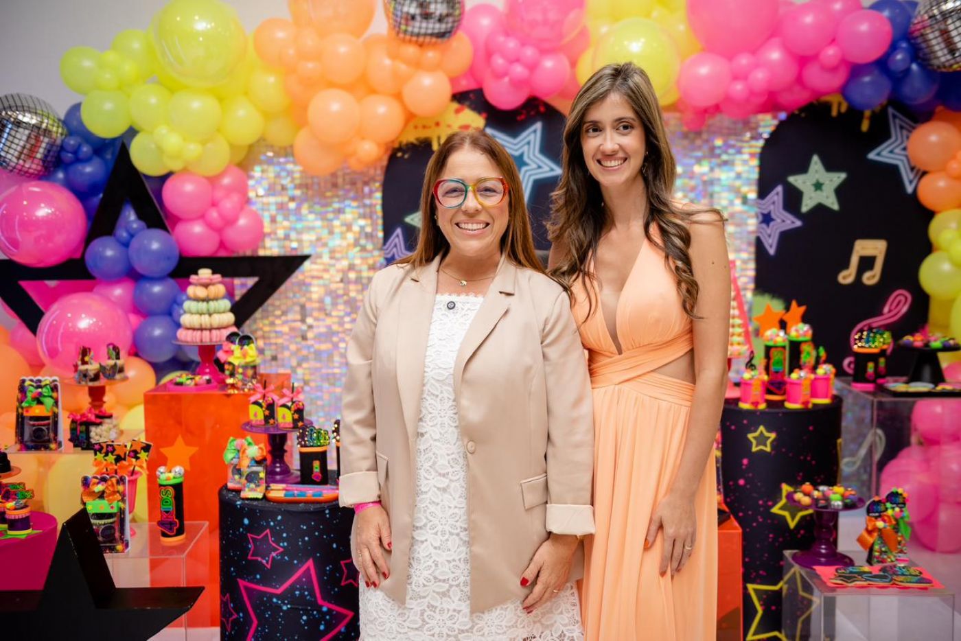O design foi pensado para agradar diferentes faixas etárias: o salão principal recebe decoração colorida e vibrante para encantar as crianças, enquanto a área do bolo e a entrada seguem uma proposta mais neutra, permitindo que cada família personalize conforme seu estilo.