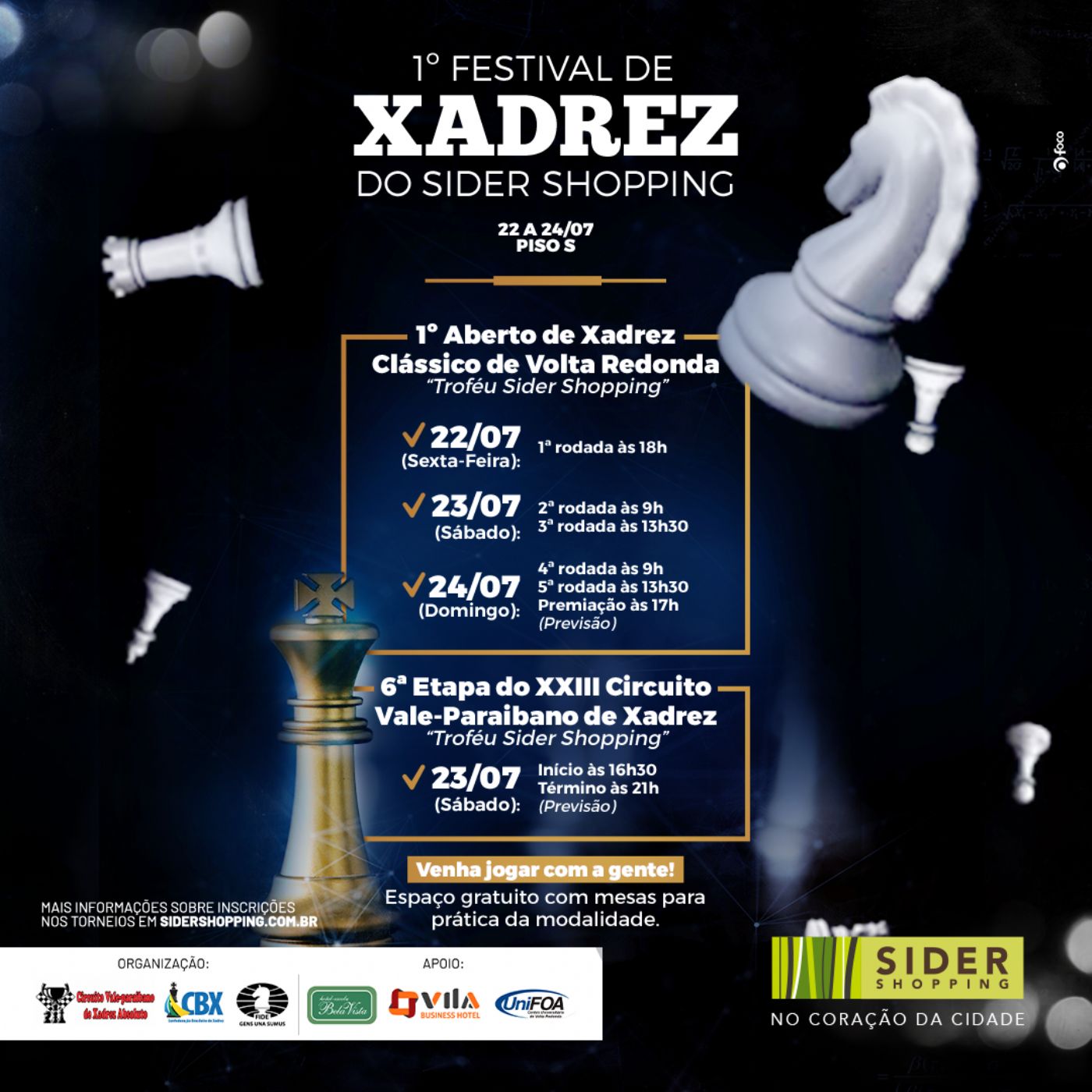 Com o objetivo de contribuir para divulgação, disseminação e melhoria do nível técnico do xadrez vale-paraibano e proximidades o Sider Shopping realizará, entre os dias 22 e 24 de julho, o “1º Festival de Xadrez – Sider Shopping”. O evento, válido pelo calendário de provas estadual (FEXERJ), nacional (CBX) e internacional (FIDE), sediará o 1º Aberto de Xadrez Clássico de Volta Redonda e a 6ª Etapa do XXIII Circuito Vale-Paraibano de Xadrez.