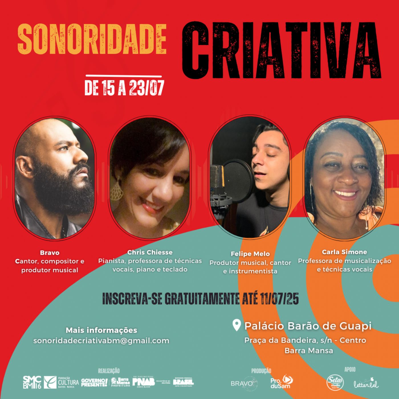 As oficinas acontecerão no Palácio Barão de Guapi, em Barra Mansa (Gratuitamente) que fica na Praça da Bandeira, s/n - Centro, Barra Mansa, Rio de Janeiro. Nos dias 15, 16 e 17/07 – Oficinas de musicalização e técnicas vocais (para todas as idades) e 22 e 23/07 – Oficina de produção musical (a partir de 18 anos).