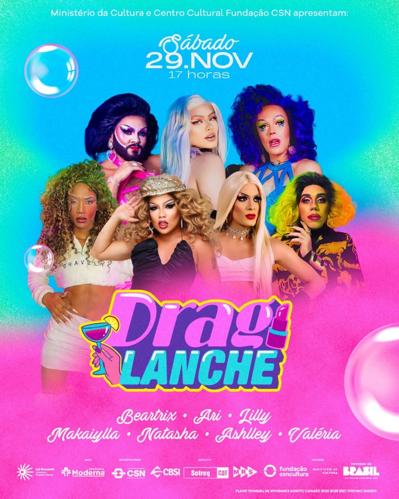 Neste sábado, 29 de novembro, a partir das 17h, o Centro Cultural Fundação CSN recebe a primeira edição do Drag Lanche, evento que promete colorir o Sul Fluminense com arte, performance e muita diversão.