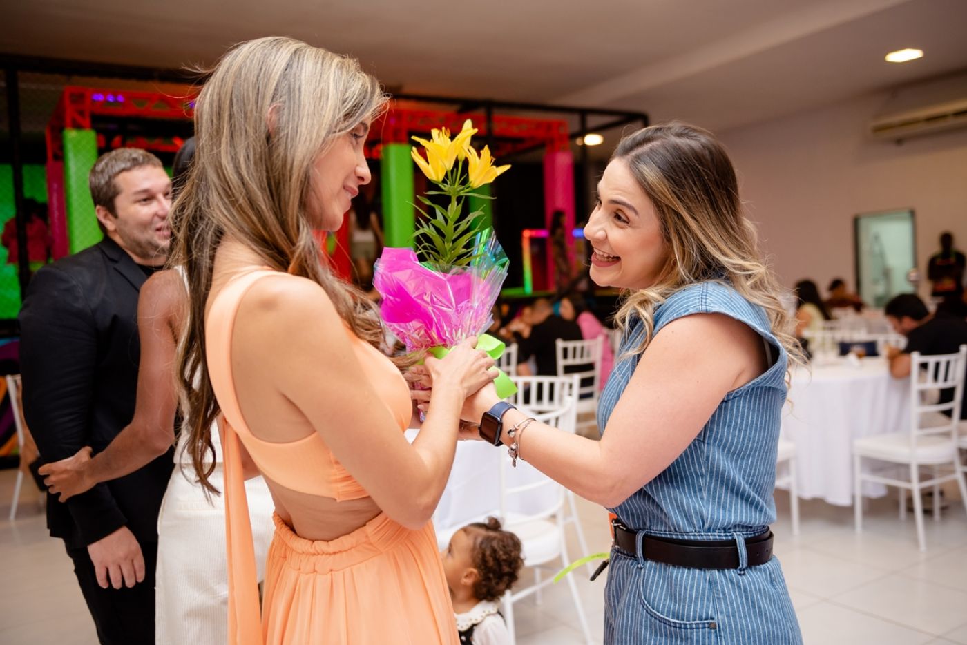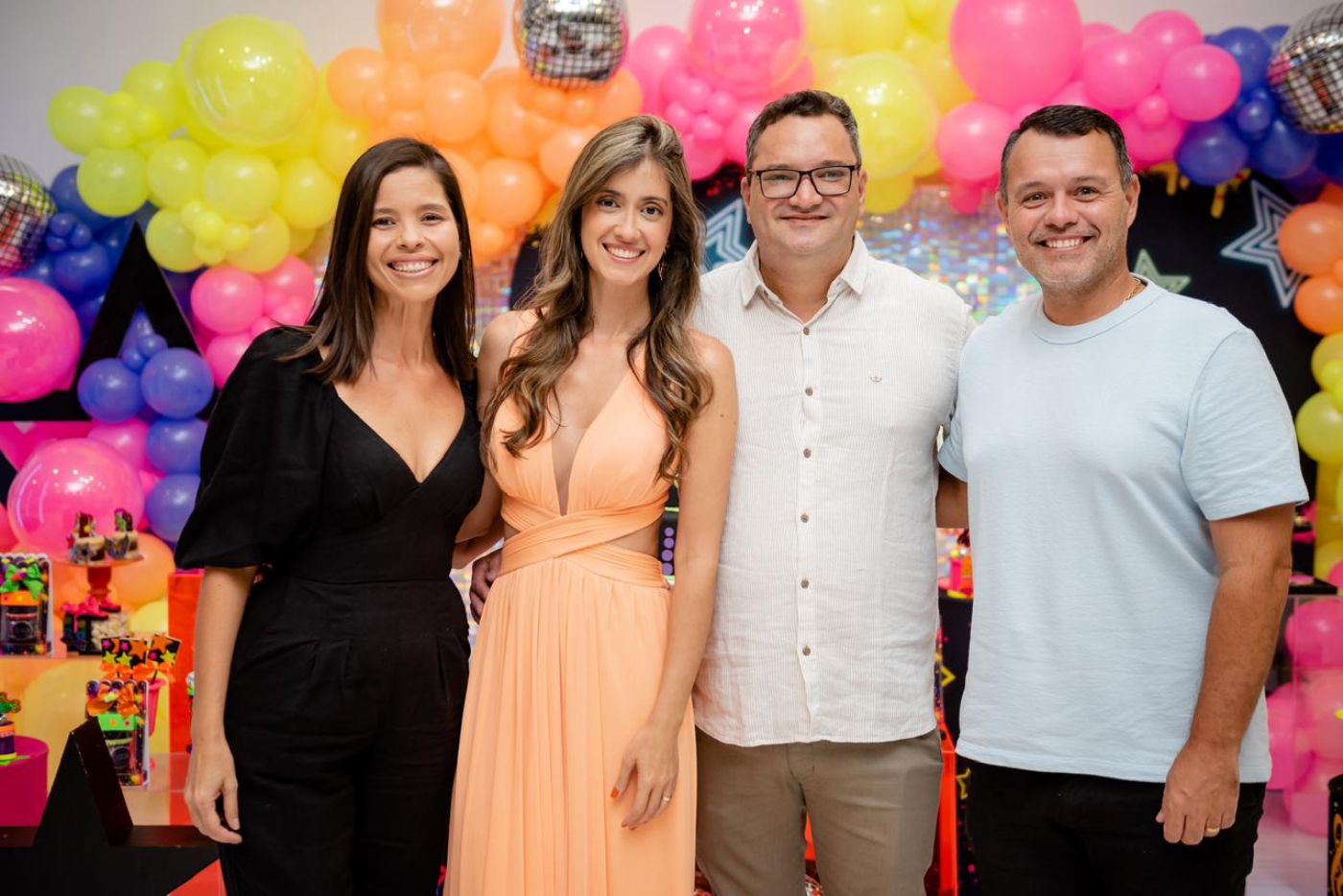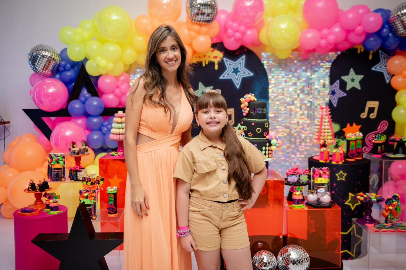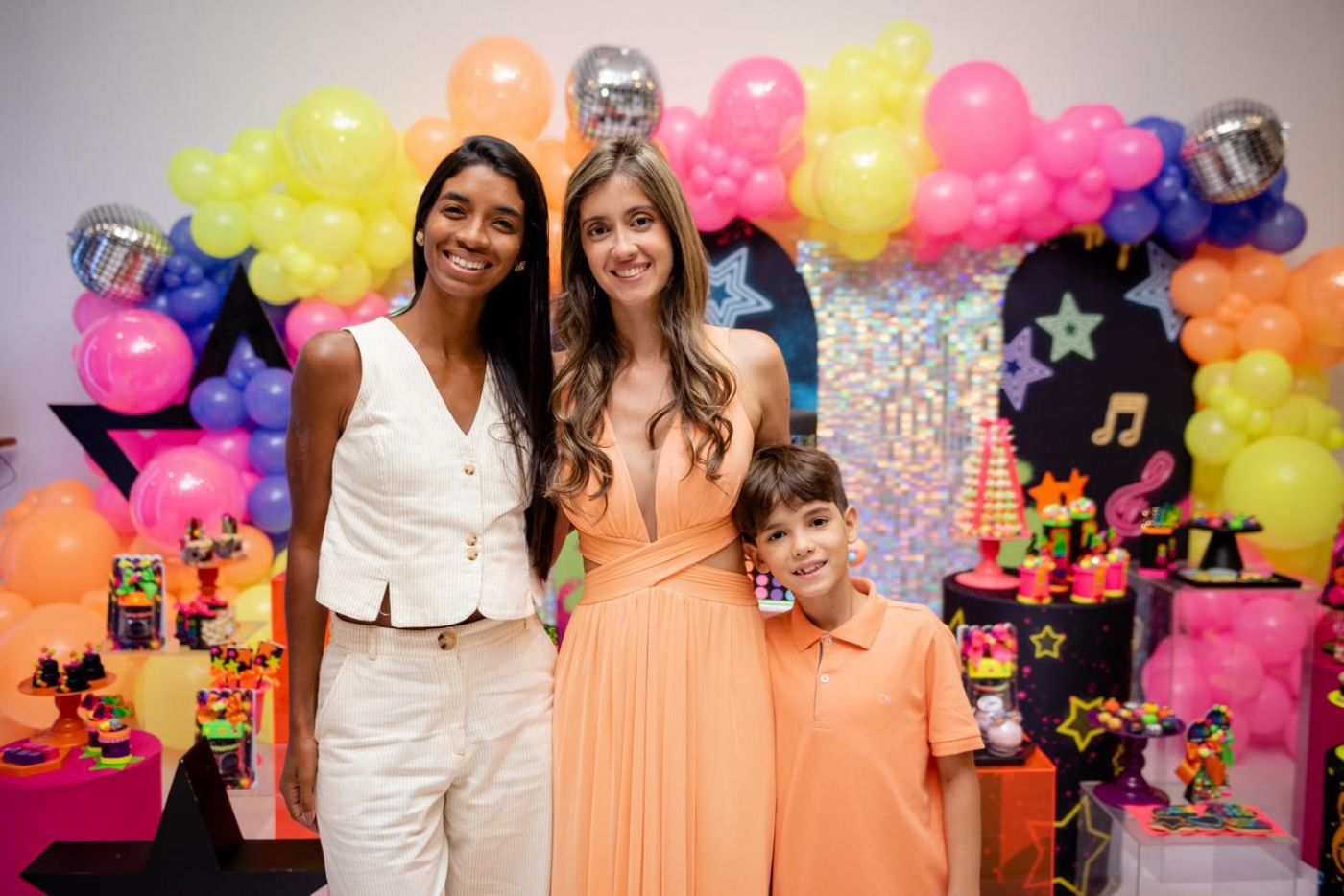 O design foi pensado para agradar diferentes faixas etárias: o salão principal recebe decoração colorida e vibrante para encantar as crianças, enquanto a área do bolo e a entrada seguem uma proposta mais neutra, permitindo que cada família personalize conforme seu estilo.